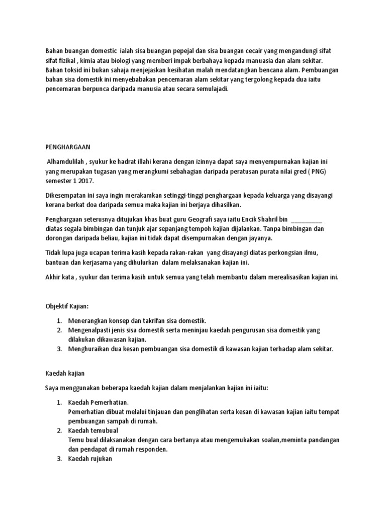 Kerja lapangan geografi tajuk : Membincangkan sisa domestik, kesan pembuangan sisa domestik dan langkah yang boleh diambil bagi mengurangkan. Kesan pembuangan sisa domestik di malaysia. Bahan buangan domestik ialah sisa buangan pepejal dan sisa buangan cecair yang mengandung i sifat sifat fizikal kimia atau biologi yang memberi impak berbahaya kepada manusia dan alam sekitar. Dskp kssm geografi tingkatan 1 dan panduan kerja lapangan 2017.